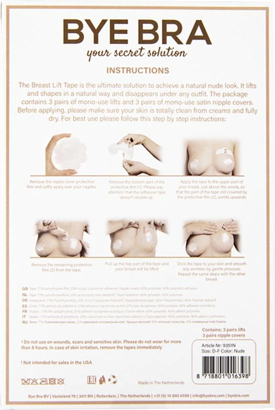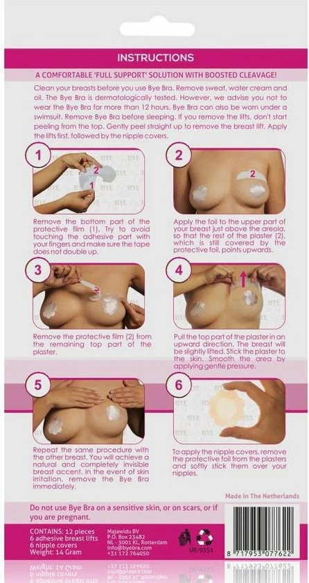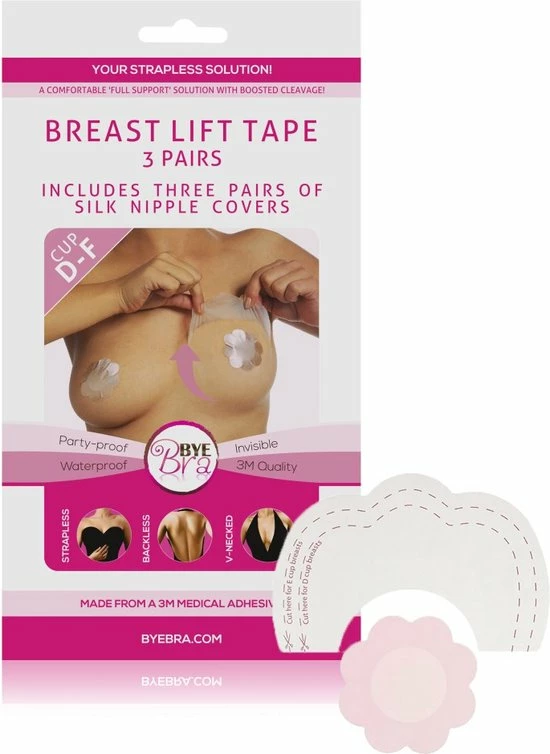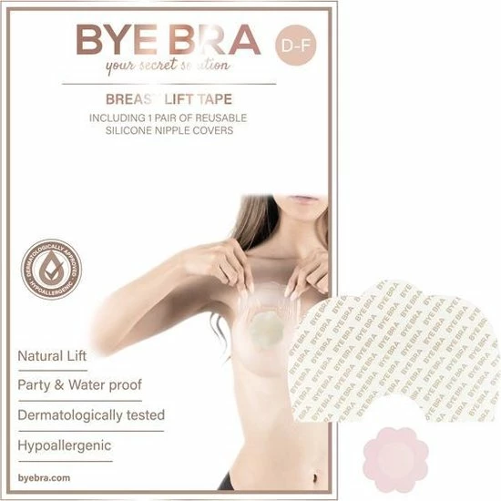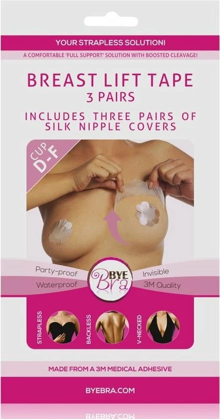 De Bye Bra plak beha is de oplossing om snel en efficiënt de borsten van een vrouw te liften, zonder dat er een BH of een operatie bij te pas komt. De Bye Bra is heel dun en bevat een flexibel zelf plakkend folie. Hiermee is het mogelijk de tepels centimeters te liften of om de borsten te corrigeren. De 3M tape is veilig voor de borsten, wat wij niet kunnen onderstrepen bij Chinese kopieën die we hier en daar op de markt zien. Ook wanneer borsten verschillen in grote of vorm is de Bye Bra plak beha een uitkomst vanwege het corrigerende vermogen.