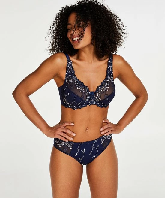 Deze niet-voorgevormde beugel bh is uitgevoerd in een ondoorzichtige stof en aan de bovenzijde afgewerkt met semi-transparant kant. De cups zijn versierd met een elegant bloemenpatroon. Maak je set compleet met de bijpassende Diva slip.