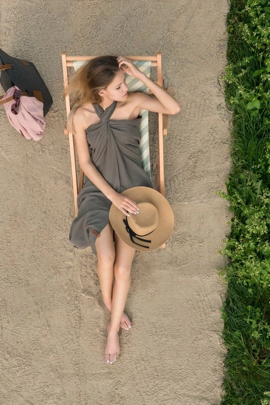 De Knit Factory Liv Pareo is een multifunctioneel kledingstuk van 100% biologisch katoen voor in het voorjaar en de zomer! Even een ijsje halen of een strandwandeling maken wordt stukken comfortabeler met deze stijlvolle pareo, die u naar keuze draagt als jurk, rok, sarong of omslagsjaal. Is het nog een beetje fris? Dan dient de modieuze katoenen doek als sjaal of omslagdoek. Zelfs als picknickkleed of zomerplaid doet hij prima dienst. Dankzij het fijne, geweven katoen is de stranddoek snel droog en valt de pareo lekker luchtig om uw lichaam. Het geweven patroon en het kenmerkende lederen label van Knit Factory geven de strandjurk een stoere uitstraling. De rechthoekige omslagdoek is 180×130 cm groot en is naast deze terra kleur verkrijgbaar in vele andere natuurlijke kleuren. Duurt het nog lang voordat het zomer is?