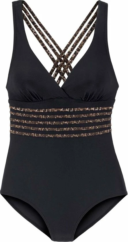 Modieus badpak met details in leo patroon. De licht gewatteerde cups zorgen voor een perfecte pasvorm. De voorkant van het eendelige stuk is bovendien gevoerd met netstof. De geraffineerde bandjes zijn op de rug gekruist.