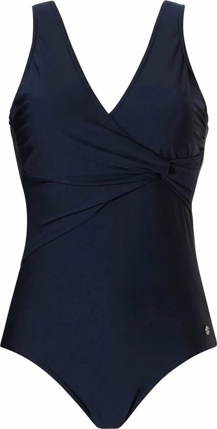Het badpak heeft een diepe donkerblauwe kleur en een “geknoopte” look.
