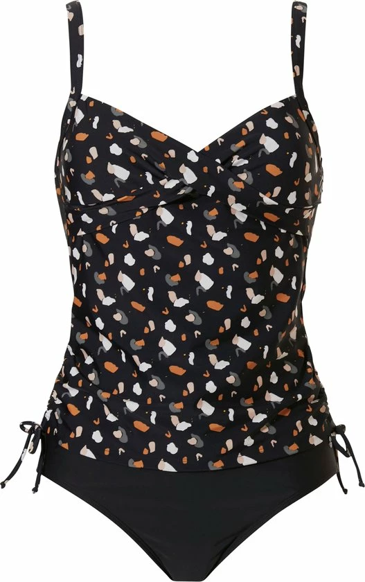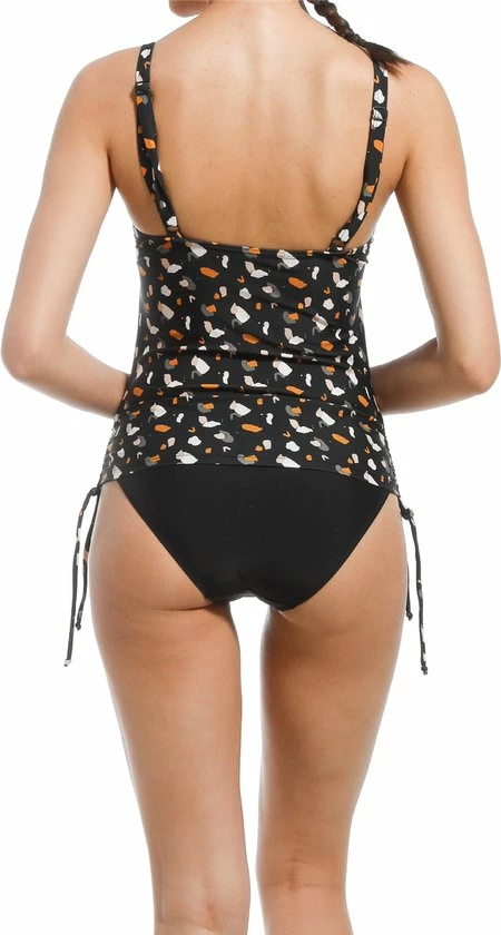 De basis kleur is zwart. Het broekje is effen zwart. De tankini top heeft een mooie wikkellook bij de buste en is gedecoreerd met vlekjes in verschillende kleuren, zoals wit, oranje en roze.