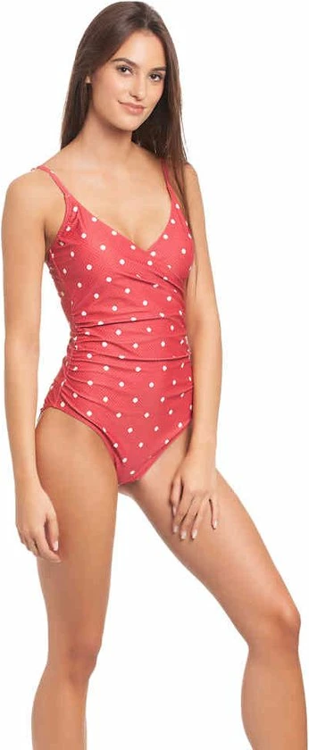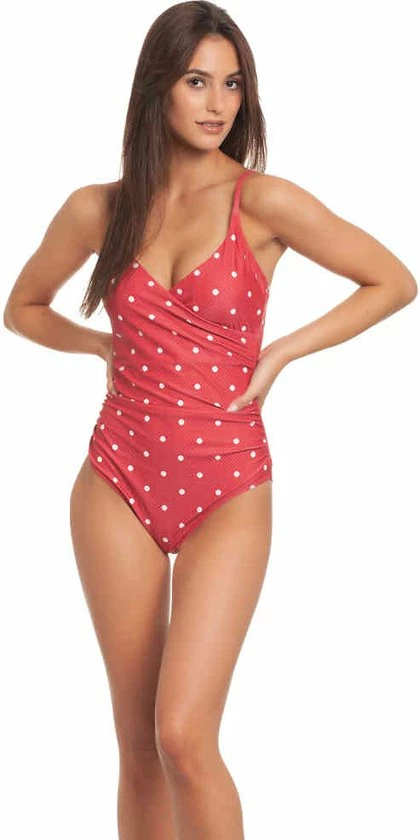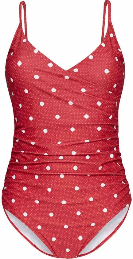 Vive Maria. Summer Maria Zwempak rood allover. Dit geweldige Vive Maria badpak is gemaakt van een comfortabele polyester-elasthaan mix. De voering aan de voorkant is gemaakt van polyester. Het badpak heeft dunne verstelbare bandjes. De armsgaten en beenuitsnijdingen zijn versierd met een zigzagnaad. De halslijn heeft een wikkellook en de opzettelijke plooien aan de linkerkant flatteren het vrouwelijke silhouet. De print toont microdots en grotere stippen op rode stof.